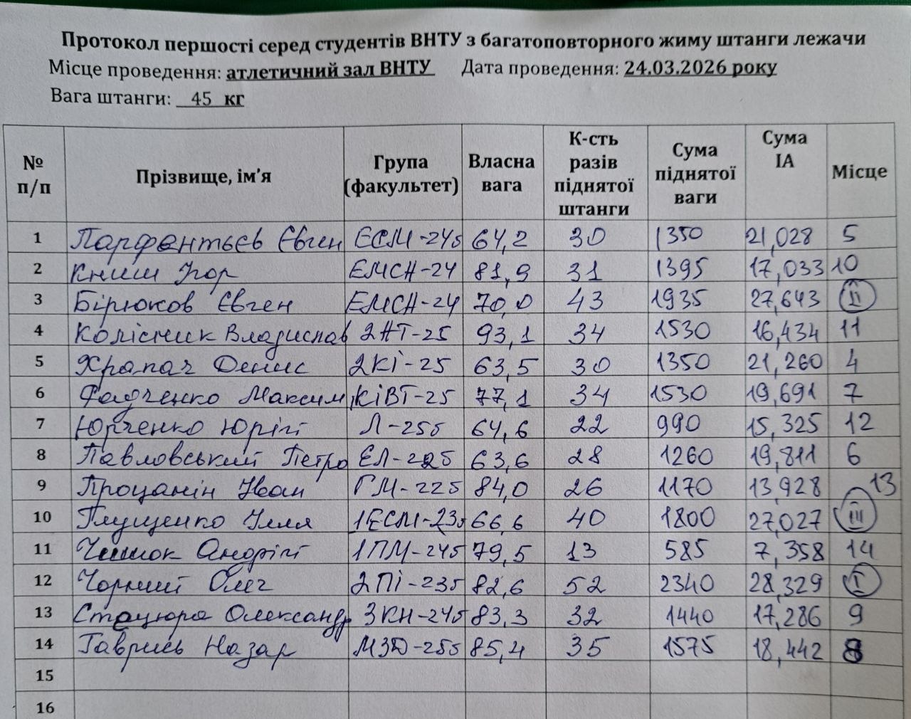 25 березня цього року, під керівництвом кафедри фізичного виховання та за підтримки адміністрації університету, відбулися змагання з багатоповторного жиму штанги лежачи серед студентів нашого університету.В цьому році вага штанги складала 45 кг і учасникам потрібно було її підійняти якомога більшу кількість разів. Після цього визначалася загальна сума піднятої ваги і ділилася на власну вагу спортсмена. Таким чином визначався індекс атлетизму (ІА) та відповідні місця на п’єдесталі пошани.
