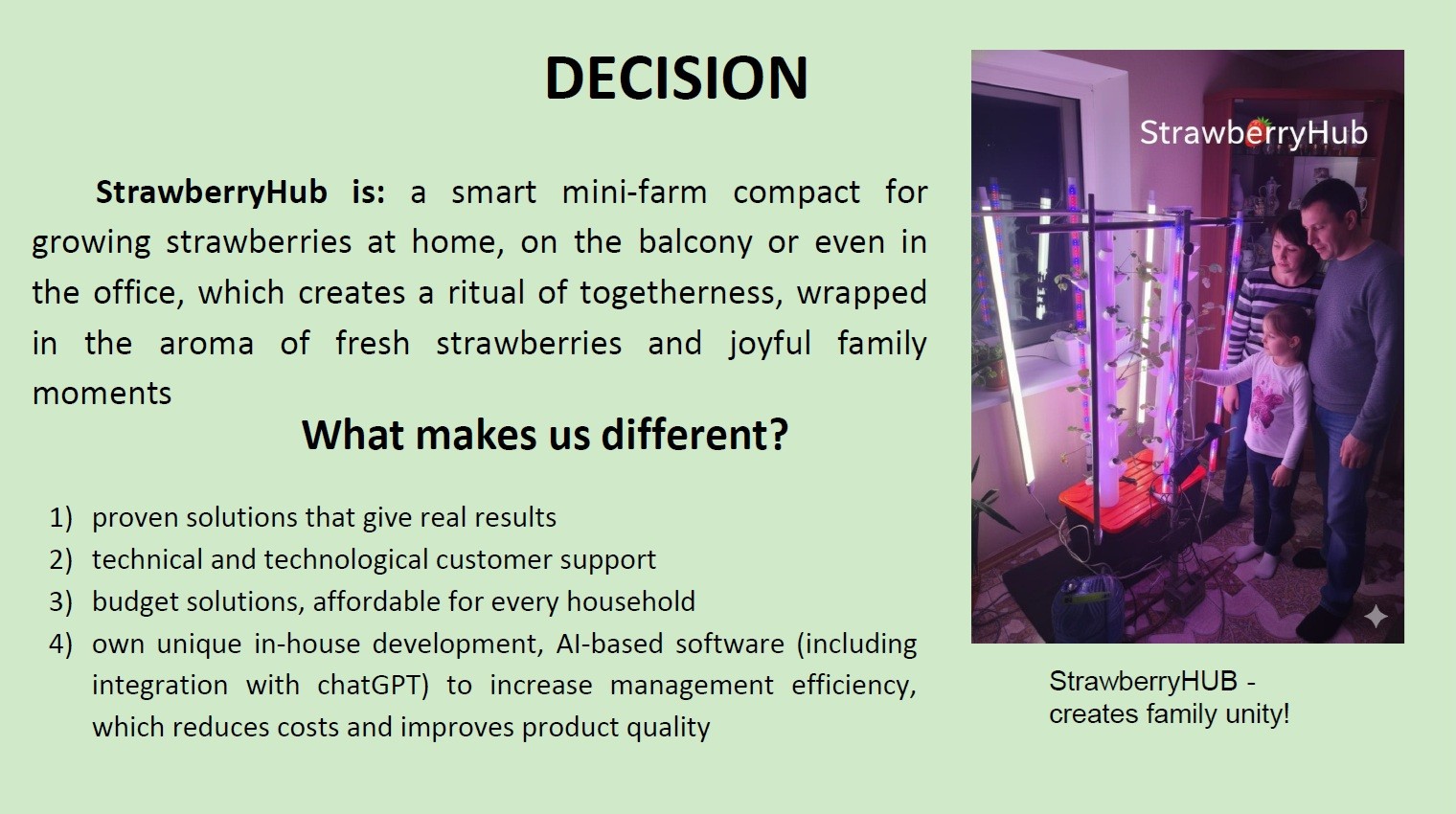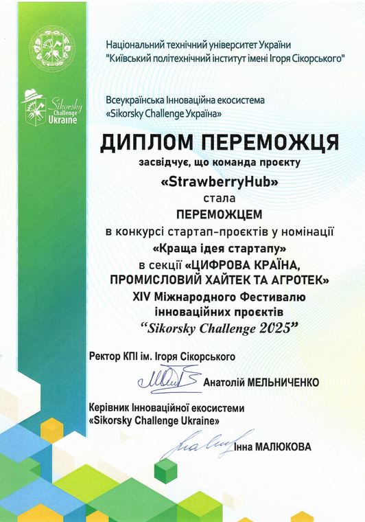 Команда StrawberryHub з поточного потоку стартап-школи – інкубатора – акселератора «Вінницький Виклик» (ВНТУ), перемогла у номінації «Ідея проєкту», Секції 4. «Цифрова країна, промисловий хайтек та агротек», отримавши високу оцінку журі за екологічність, технологічність і комерційний потенціал.