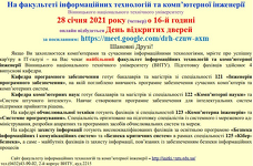 Кафедра обчислювальної техніки в понеділок, 15 березня о 10:00 проводить відеозустріч https://meet.google.com/tkt-baju-zqw зі студентами
