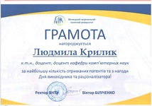 Грамотою Вінницького національного технічного університету нагороджено к. т. н., доцента кафедри комп'ютерних наук Крилик Людмилу Вікторівну за найбільшу кількість отриманих патентів за перше півріччя 2025 року та з нагоди Дня винахідника та раціоналізатора.