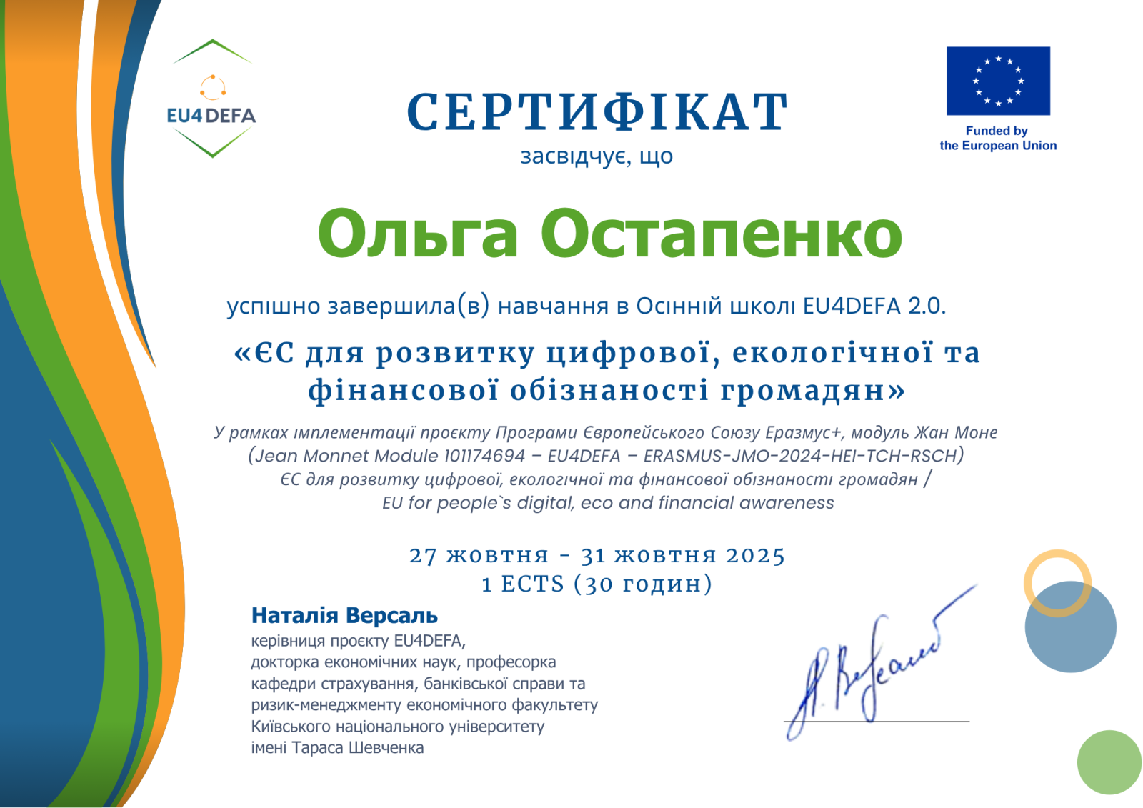 Протягом 23 червня – 3 серпня 2025 року пройшла Всеукраїнське науково-педагогічне підвищення кваліфікації "Акредитація освітніх програм: закордонний досвід" обсягом 180 годин (6 кредитів) від ЦУЄНС та Європейського університету.