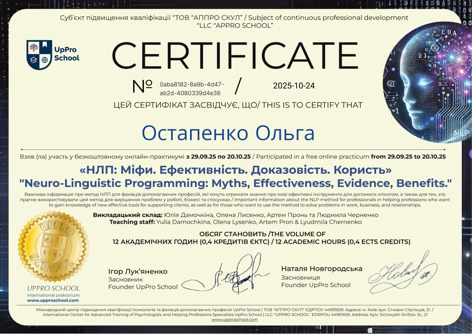 Сертифікат про підвищення кваліфікації від Національного Агентства Кваліфікацій