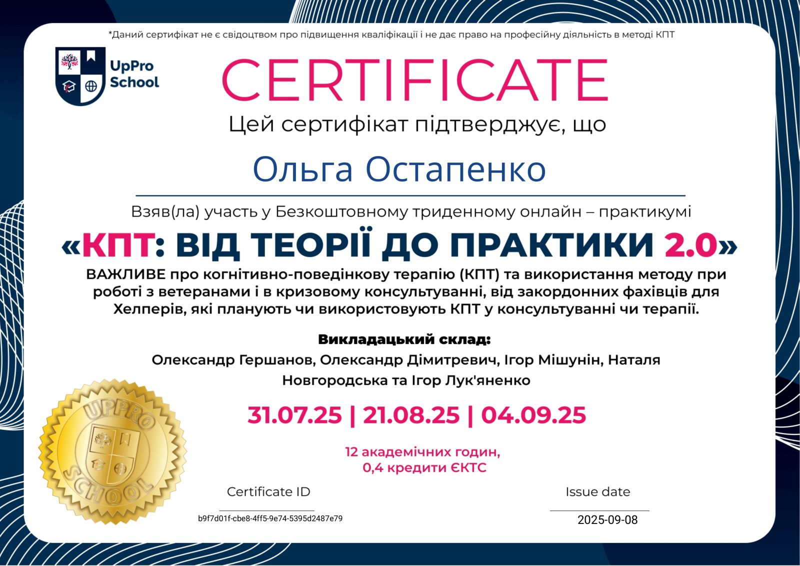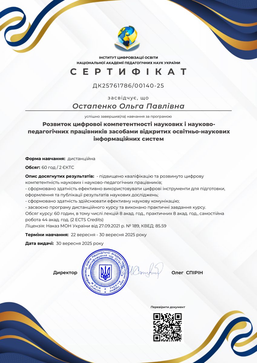 Протягом 3 березня – 13 квітня 2025 року пройшла Всеукраїнське науково-педагогічне підвищення кваліфікації "Управління якістю освіти закладу вищої освіти" обсягом 180 годин (6 кредитів) від ЦУЄНС та Центральноукраїнського державного університету імені Володимира Винниченка.