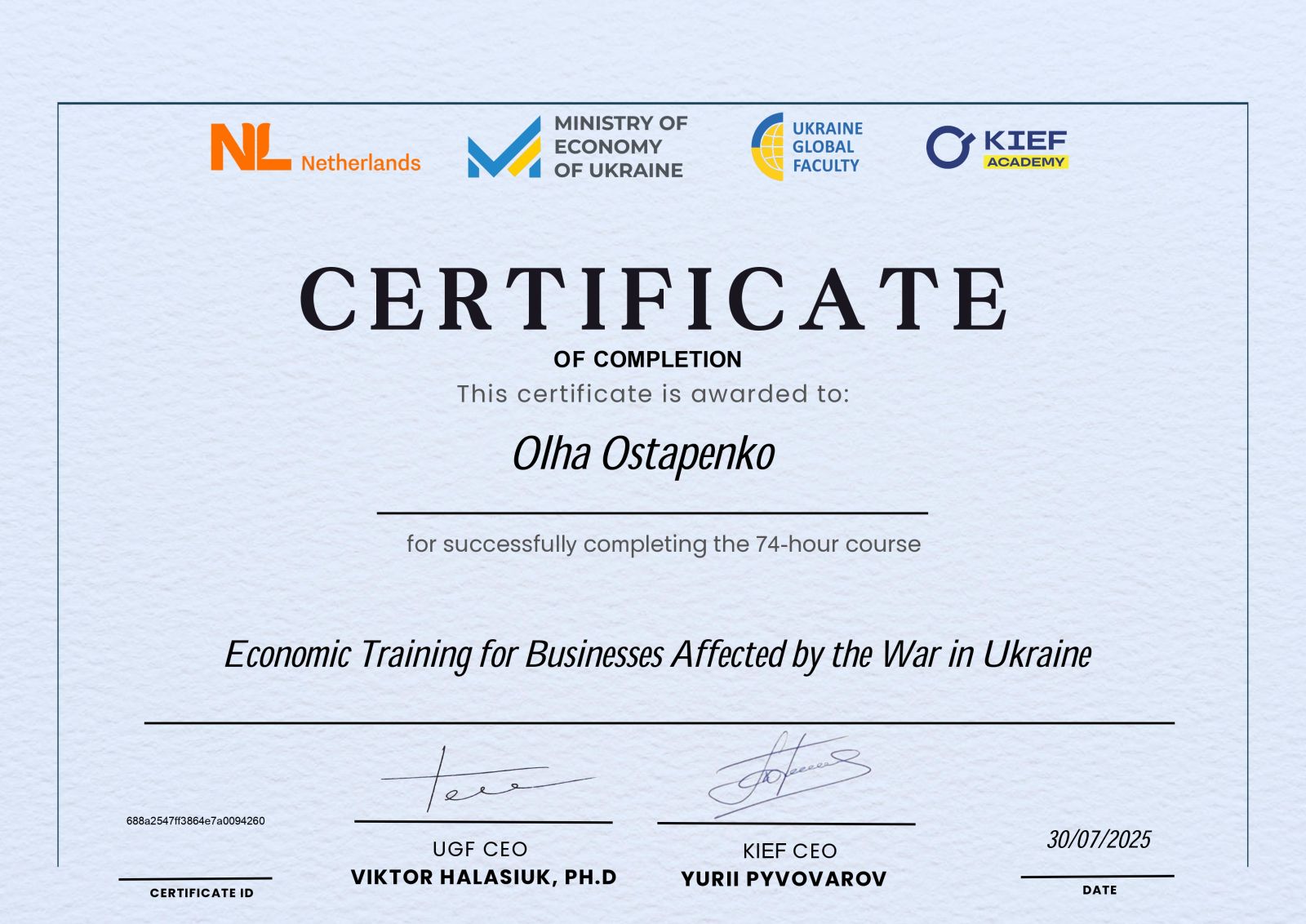 Протягом березня-липня 2025 року брала участь у проєкті «Економічне навчання для підприємств, постраждалих від війни в Україні», що проводився за підтримки Міністерства закордонних справ Нідерландів у рамках програми зовнішньої політики розвитку Нідерландів, що фінансується програмою розвитку приватного сектору Агентства з питань підприємництва Нідерландів (RVO.nl). Проєкт реалізовано Академією КМІФ (ГО «Київський міжнародний економічний форум») на платформі Ukraine Global Faculty під егідою Міністерства економіки України та спрямований на зміцнення стійкості, відновлення та розвитку малих та середніх підприємств в Україні. Провідні світові та українські експерти провели 36 лекцій та семінарів, що охоплюють економіку, системне мислення, стратегію, штучний інтелект, фандрейзинг, кризове управління, бережливе виробництво, PR тощо. За результатами навчання отримано сертифікат.