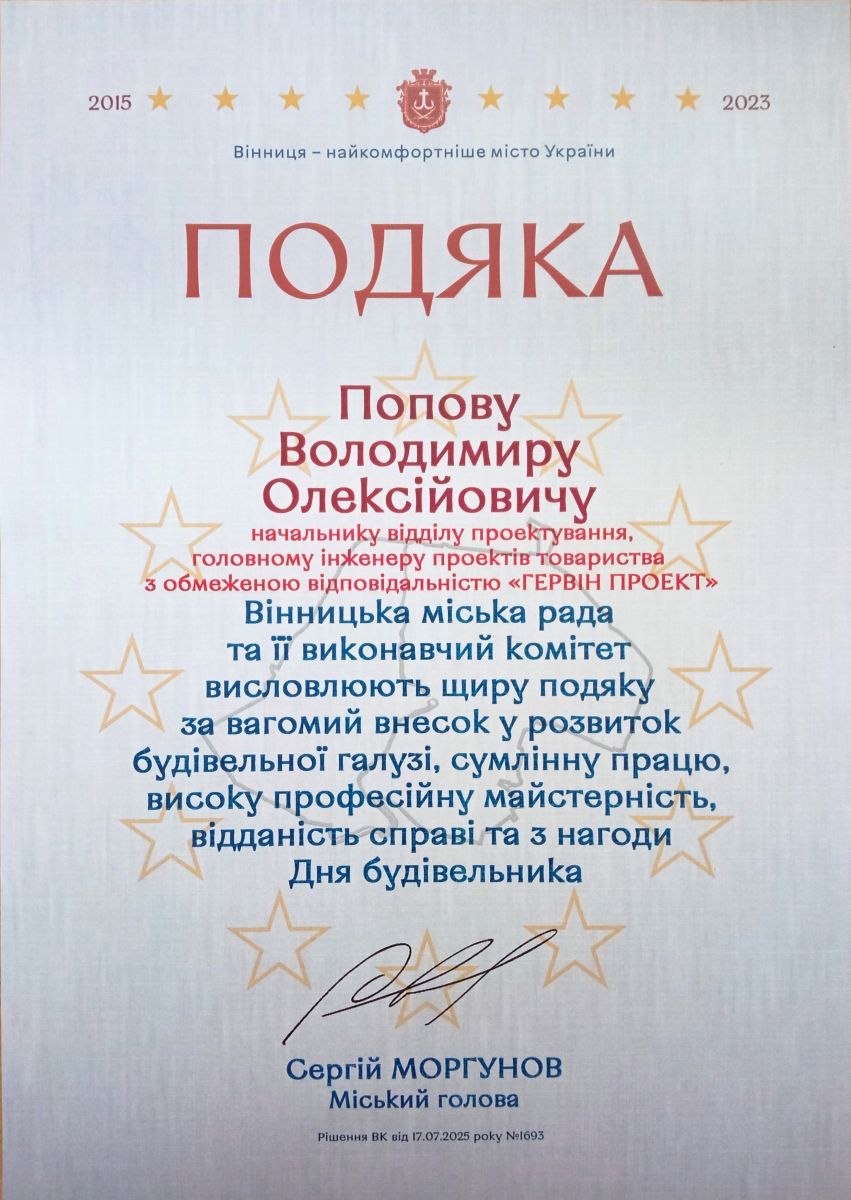 Нове будівництво комунікаційного тунелю під дорожнім одягом вул. Лук’яненка на відрізку від перехрестя з вул. Шимка до перехрестя з вул. Зерова в м. Вінниці. Гол. констр. - Попов В.О. (2025). Проект на стадії завершення.