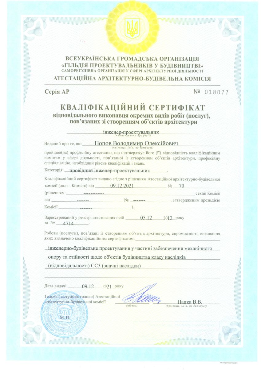2.6. Проект підсилення конструкцій будівлі Свято-Петропавлівської церкви по вул. Тургєнєва в м. Буча Києво-Святошинського району, Київської області. Головний архітектор проекту – Косарєв В. І. Головний конструктор – Попов В.О. (2011). Проект реалізовано.