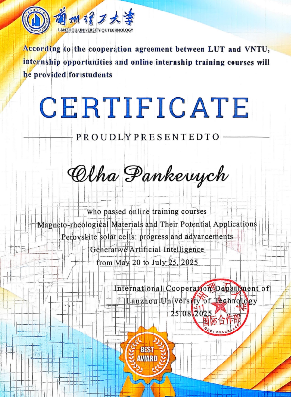 - Сертифікат учасника LIV Всеукраїнської науково-технічної конференції підрозділів ВНТУ (2025).