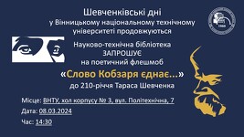 Бібліотека Вінницького політеху ЗАПРОШУЄ на поетичний флешмоб «Слово Кобзаря єднає...», до 210-річчя видатного українського поета, художника Тараса Григоровича Шевченка