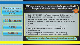 20 березня науково-технічна бібліотека зорганізувала проведення інформаційного заходу «День аспіранта в бібліотеці ВНТУ». Зустріч проходила в форматі онлайн.