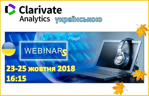 Науково-технічна бібліотека ВНТУ в рамках Міжнародного Тижня Відкритого Доступу запрошує вас 23, 24, 25 жовтня 2018 року взяти участь у черговій серії вебінарів про ресурси платформи Web of Science від компанії Clarivate Analytics. Вебінари починаються о 16:15. Необхідна попередня реєстрація на ...